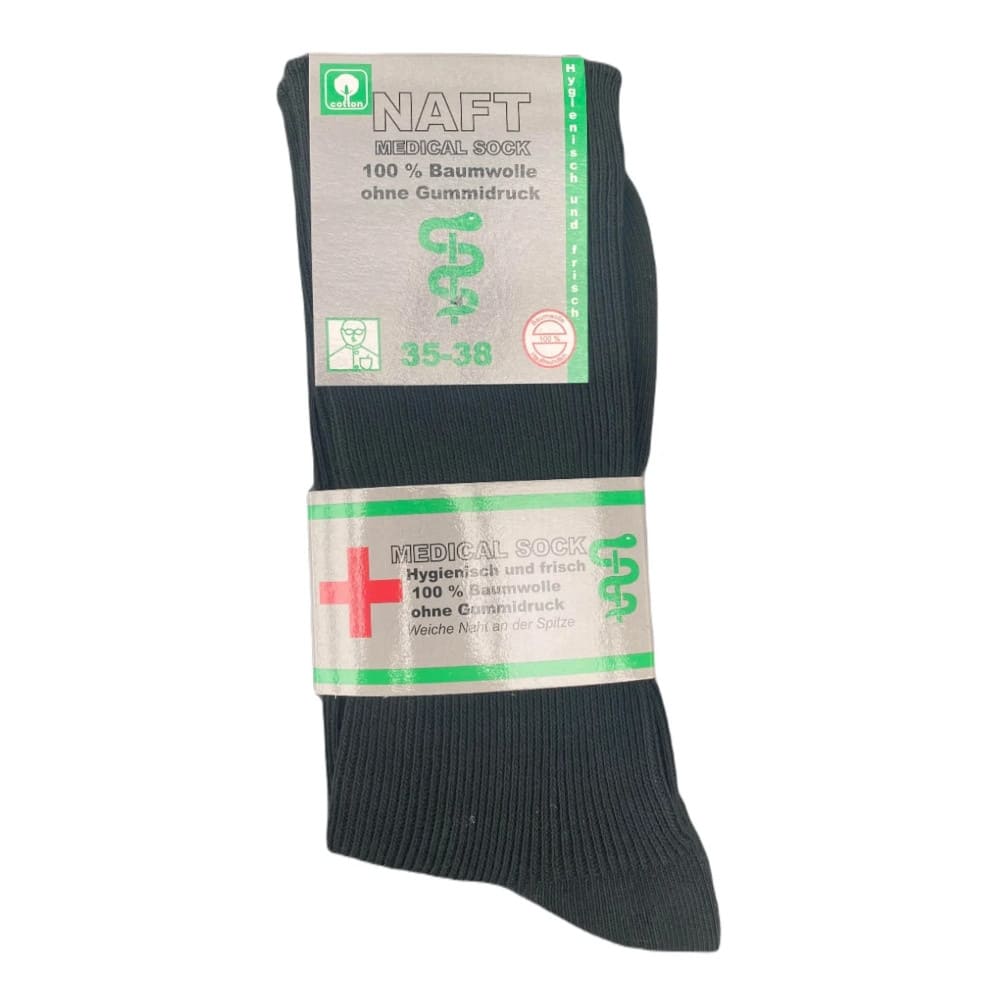 4 Paar medische sokken zwart van Naft. Deze sokken zijn van 100 % katoen en hebben geen voelbare naad bij de tenen, ze voorzien in specifieke medische behoeften. Zo knellen ze niet doordat er geen elastiek in de boord zit, doordat ze geribbeld zijn zakken ze echter niet af. Ze zijn ontworpen om de bloedcirculatie te verbeteren, zwelling te verminderen en het risico op bloedstolsels te voorkomen. Ideaal voor diabetici, mensen met zeer gevoelige huid, oedeem of vernauwde bloedvaten. Medische sokken of apothekers sokken zijn 100% katoen en daardoor anti transpiratie wat de hygiëne ten goede komt en de kans op wondjes verkleind.
