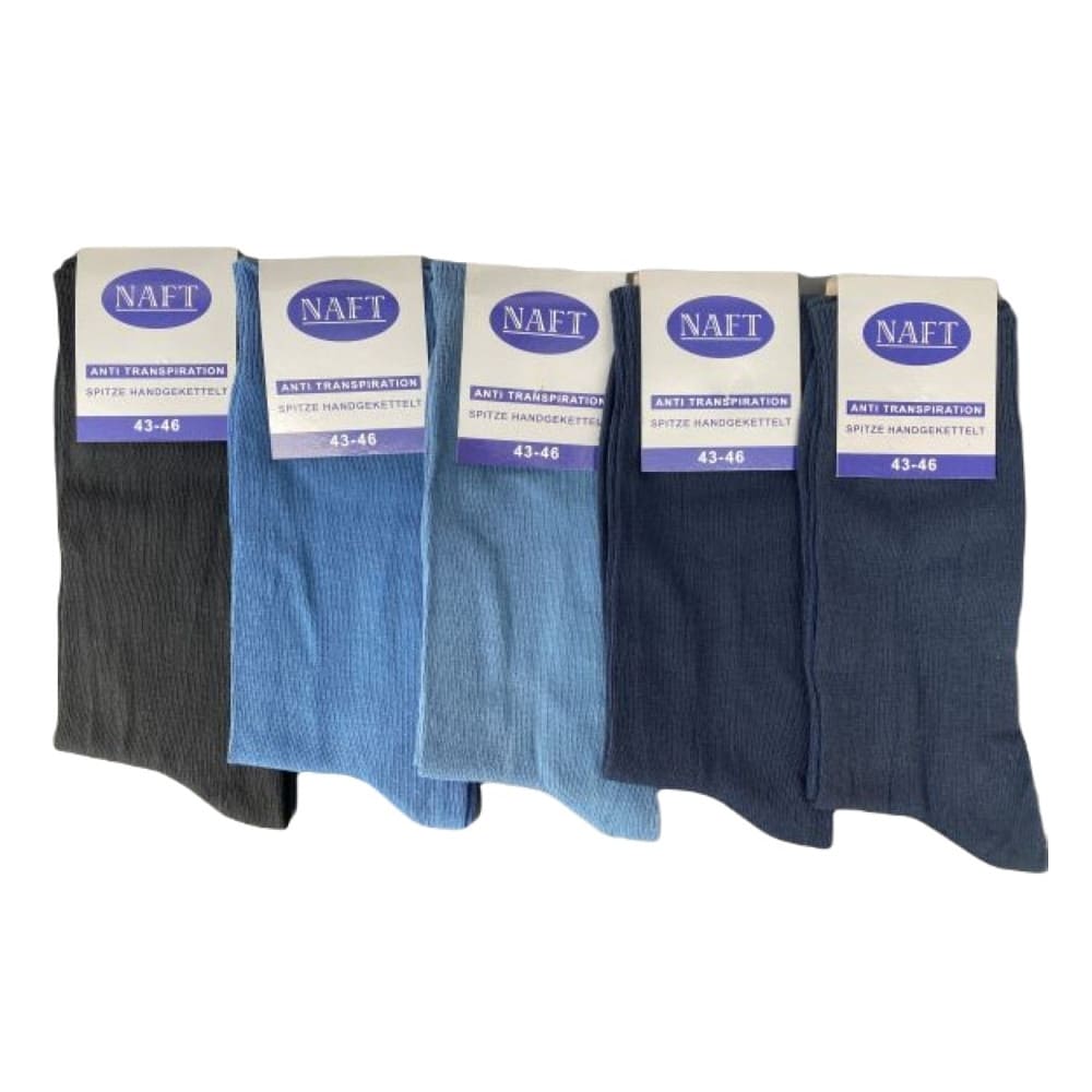 Nette heren sokken van Naft van 100 % katoen zijn zeer comfortabel en houden je voeten de hele dag heerlijk droog en fris. Je ontvangt 5 verschillende kleuren blauw zodat je altijd een passende kleur hebt bij je broek of schoenen. Daarnaast hebben deze sokken geen naad op de tenen waardoor je geen last hebt van irritatie of blaren op je kleine teen. Deze sokken zijn slijtvast en gaan lang mee, ook bij dagelijks gebruik. Deze katoenen sokken zijn in Europa geproduceerd en hebben geen snijdende boord waardoor je geen irritatie ervaart